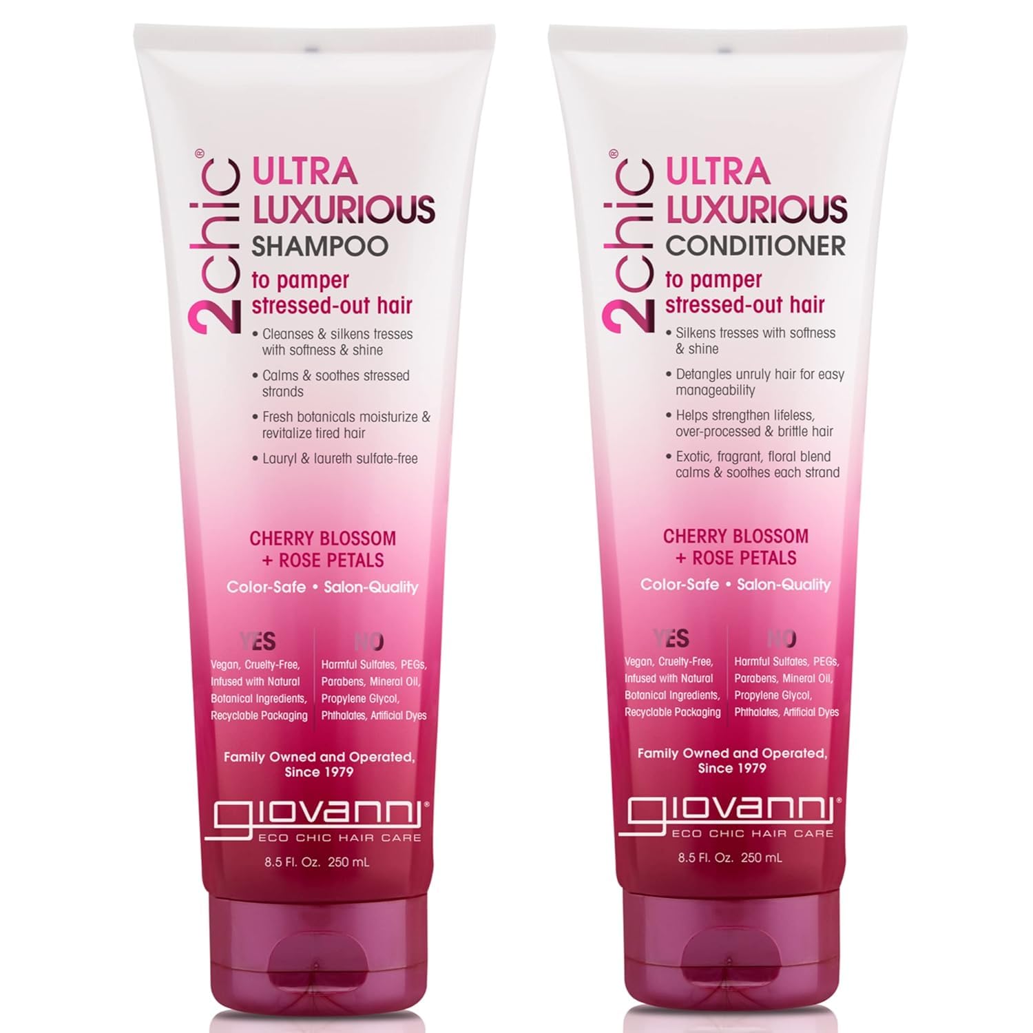 Details: GIOVANNI 2chic Ultra-Luxurious Shampoo & Conditioner Set is powered by our exclusive Dual Calming Complex of Cherry Blossom & Rose Petals. Along with Aloe Vera and other botanicals this Set helps detangle and restore shine. Look in the Ingredients section for a listing of *USDA certified organic ingredients.