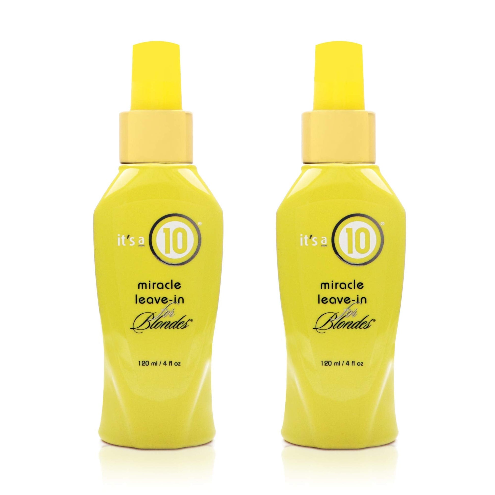 Details: Blondes can keep having more fun with the best treatment for damaged hair. IT'S A 10 ~ MIRACLE LEAVE-IN FOR BLONDE 4 OZ ~ 2 pack helps both natural and color-treated blondes make the most of their light locks with its nourishing formula. This product detangles, defrizzes, enhances highlights, infuses moisture, and gives hair gloss and manageability without leaving behind dulling residue.