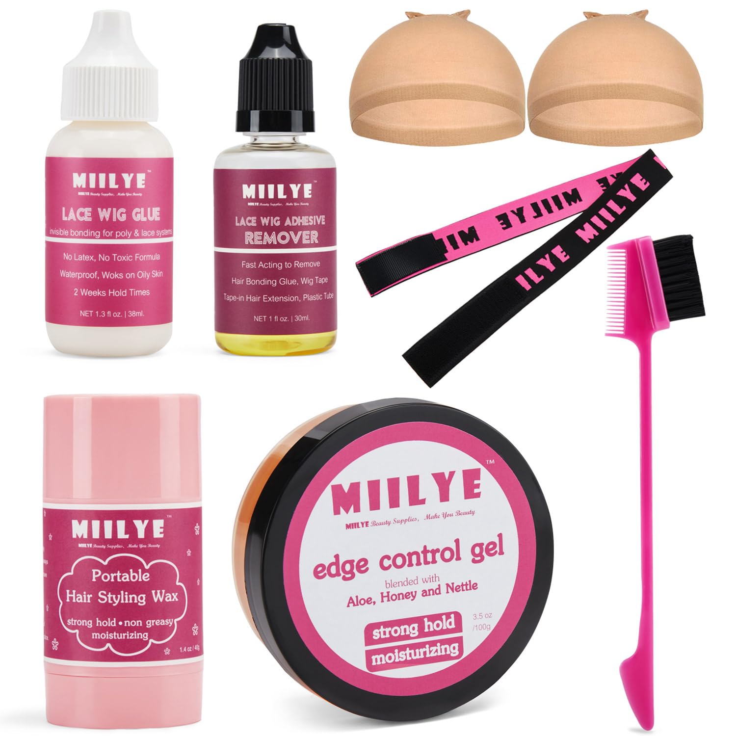 - Everything You Need for Wig Installation Are Included in MIILYE Wig Installation Kits: MIILYE lace glue 1.3oz, MIILYE lace glue remover 1oz, MIILYE hair stylish wax stick 1.4oz, MIILYE edge control gel 3.5oz, 2x wig caps, 1x MIILYE lace melting band and 1x multifunctional edge brush;